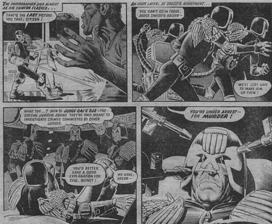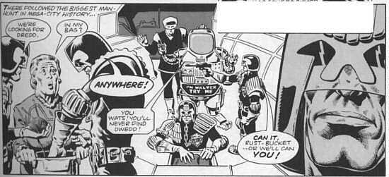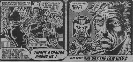 To make it simple a robot was the culprit. Dredd defeated his android double and saved enough to prove it was the killer. But a question remained ... Art by Brendan McCarthy and Brett Ewins.