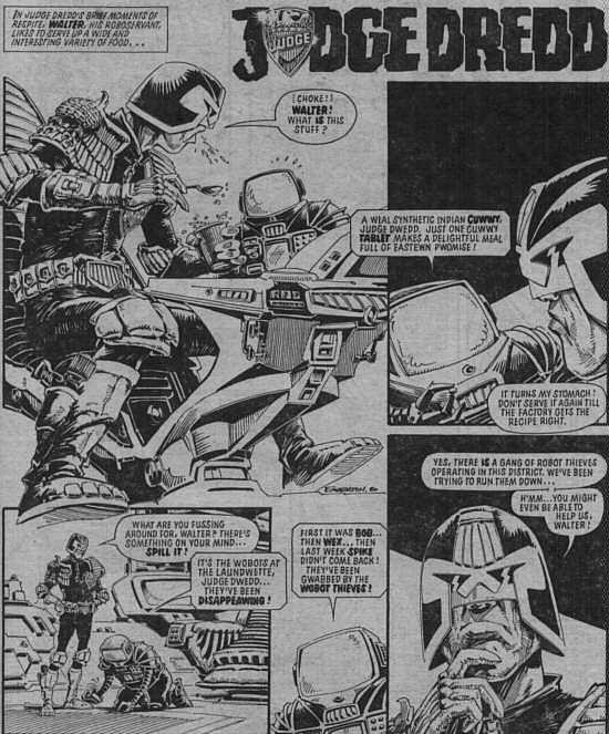 So how did the scene on this cover come about? Well it all started one day when one of Walter's culinary experiments was too much even for an iron man like Dredd. Art by Ian Gibson from Prog 191