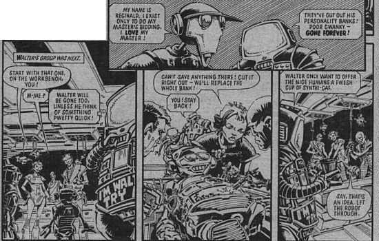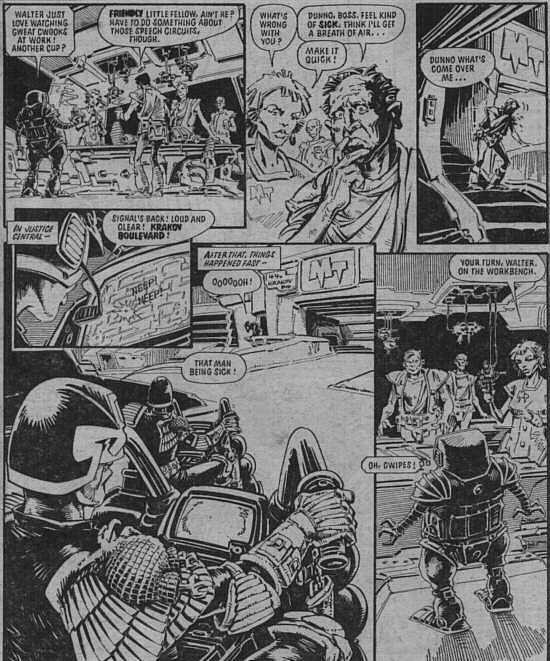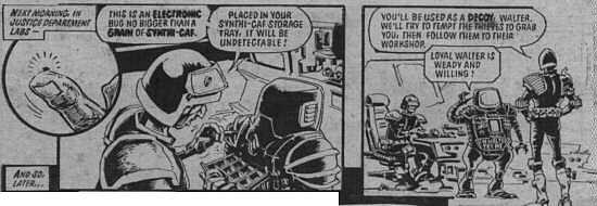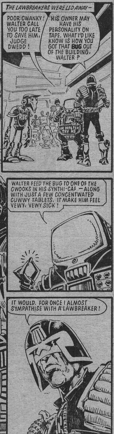 Like the van the perp's headquarters were shielded so Dredd had no way to track Walter and he had no way to let Dredd know their location. Cranky was dragged off for reprograming and all too soon returned from the operating room with a new name and no memories. Ready to be sold on the black market. Walter realized he had to signal Judge Dredd fast.